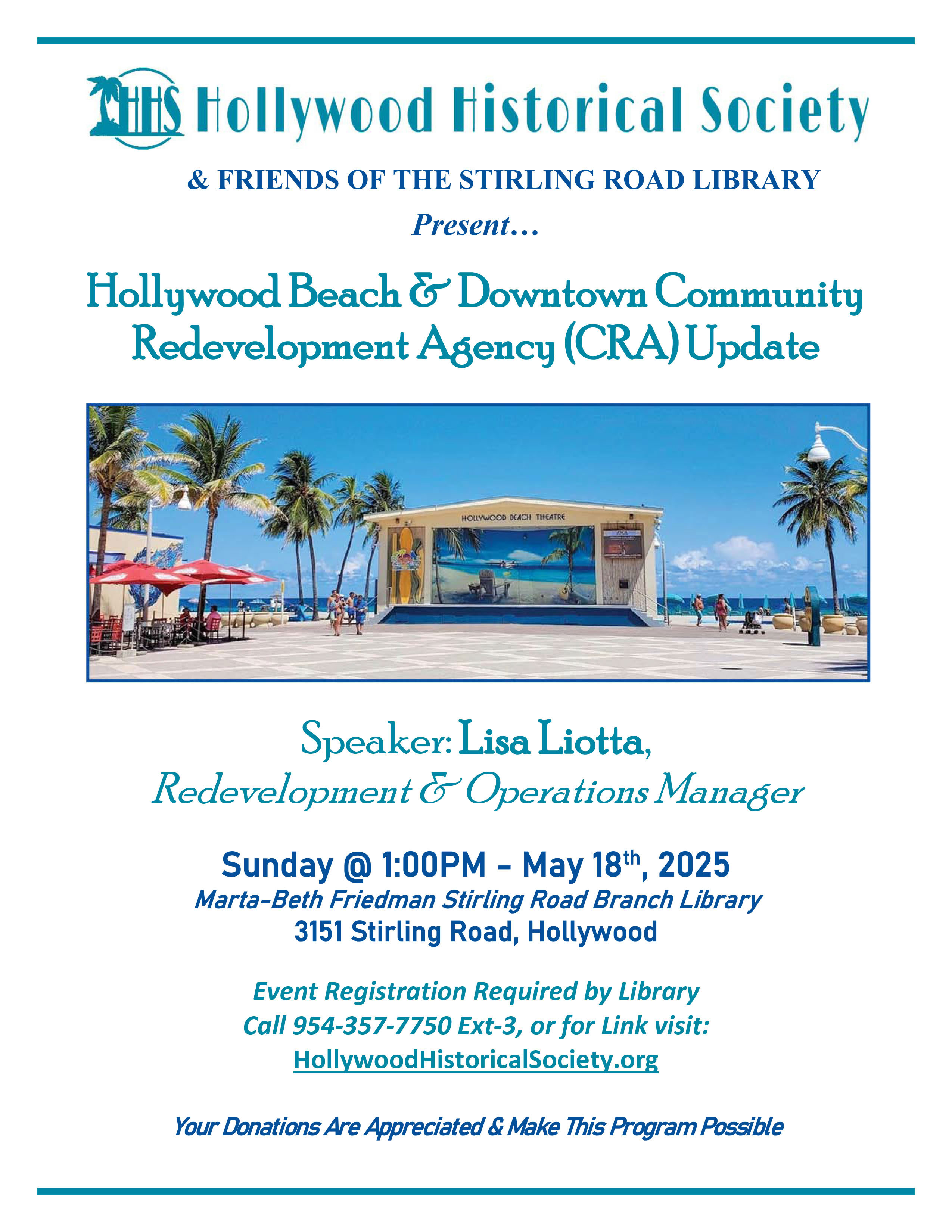 Please contact us to see how you can help our historic community!Phone: 954-923-5590 || email: HollywoodFLhistory@att.net Mail Checks to: Hollywood Historical Society, P.O. Box 222755, Hollywood, FL 33022 |