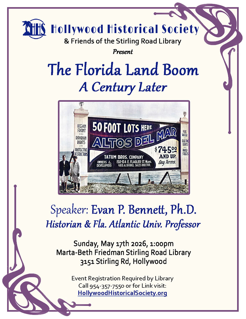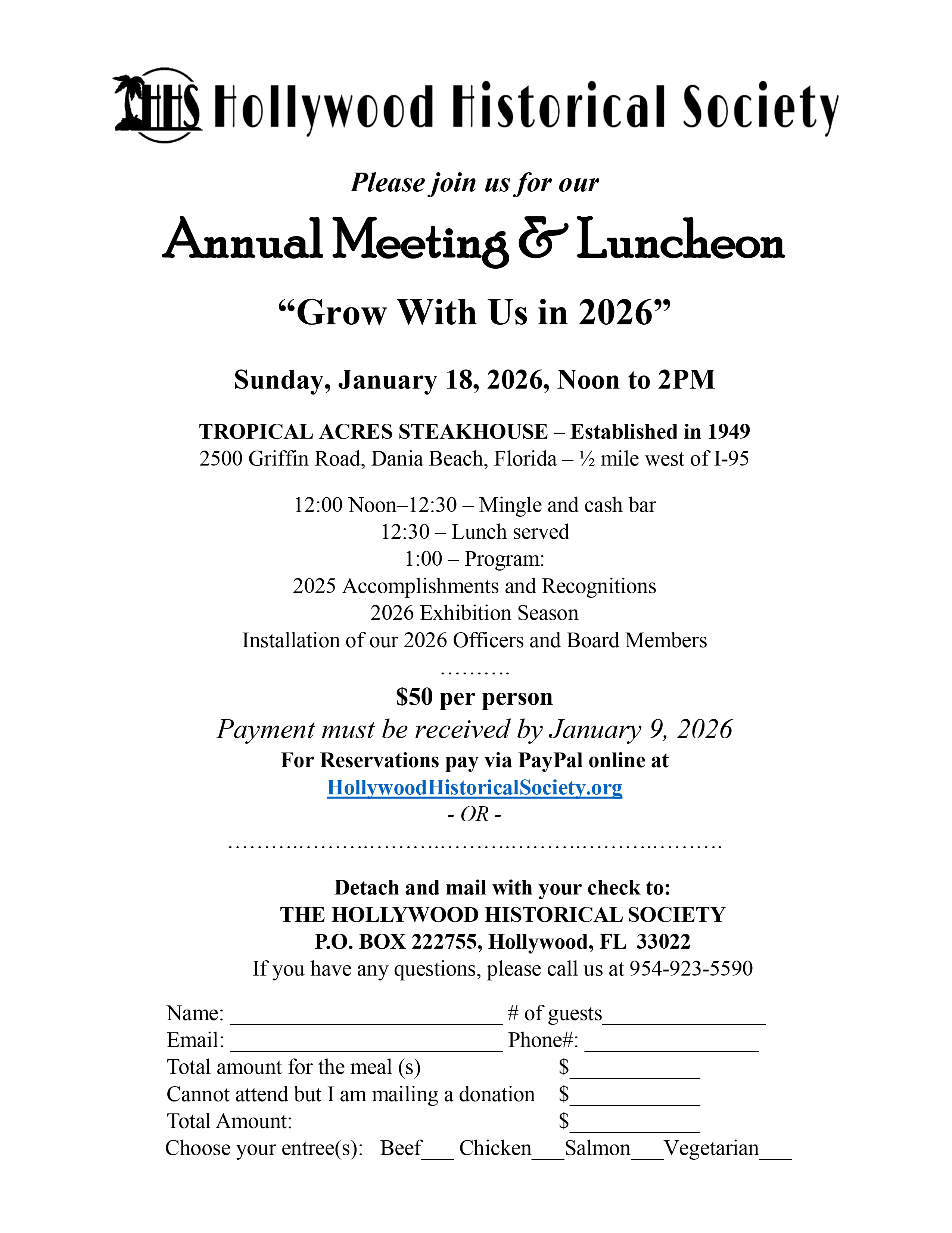 Please contact us to see how you can help our historic community!Phone: 954-923-5590 || email: HollywoodFLhistory@att.net Mail Checks to: Hollywood Historical Society, P.O. Box 222755, Hollywood, FL 33022 |
