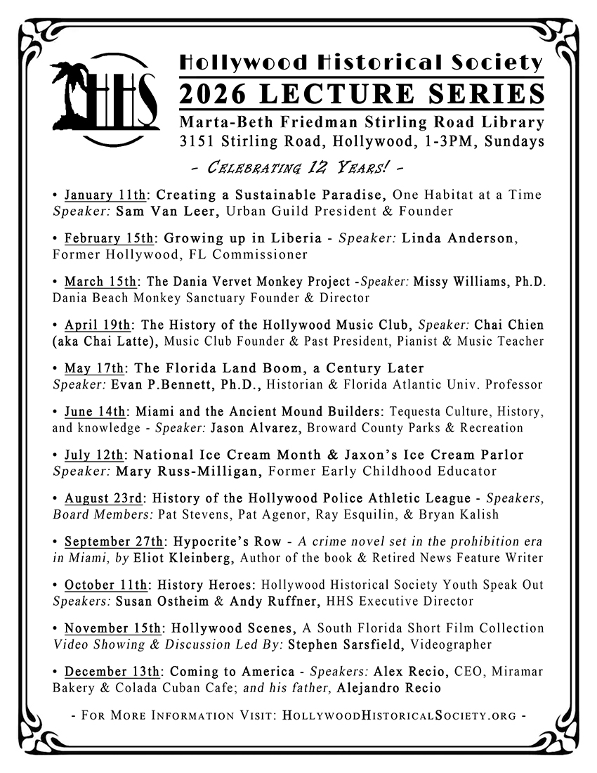 Please contact us to see how you can help our historic community!Phone: 954-923-5590 || email: HollywoodFLhistory@att.net Mail Checks to: Hollywood Historical Society, P.O. Box 222755, Hollywood, FL 33022 |