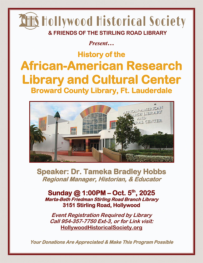 2025 Lecture Series Monthly at the Stirling Road Library October Lecture: History of AARLCC Library's Required Registration LINK -See our 2025 Schedule for more upcoming Lectures- ___________________