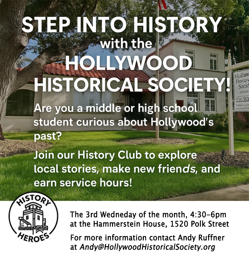 Please contact us to see how you can help our historic community!Phone: 954-923-5590 || email: HollywoodFLhistory@att.net Mail Checks to: Hollywood Historical Society, P.O. Box 222755, Hollywood, FL 33022 |