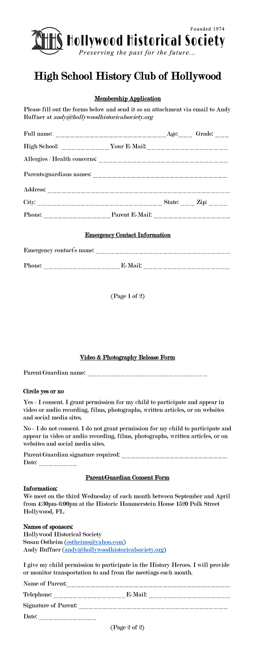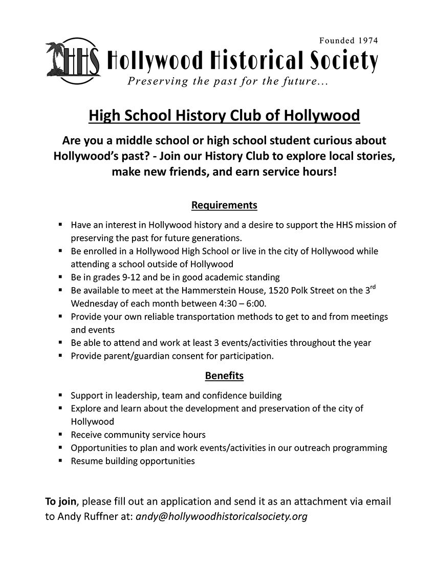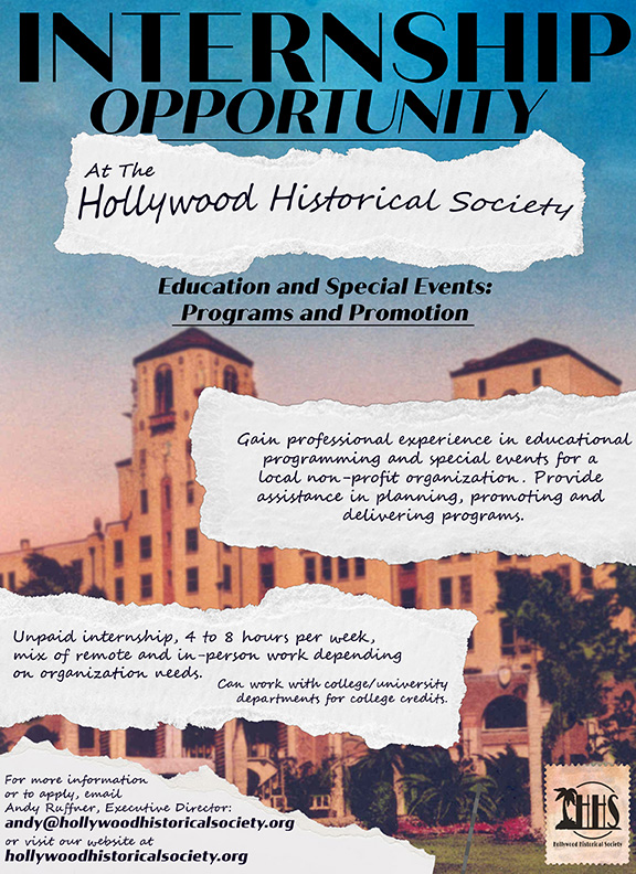 for College/University Students for our educational For more information, or to apply, contact Andy Ruffner, HHS Executive Director, at Andy@HollywoodHistoricalSociety.org ______________________________________