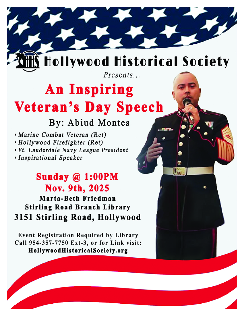 2025 Lecture Series Monthly at the Stirling Road Library November Lecture: Veteran's Day Speech Library's Required Registration LINK -See our 2025 Schedule for more upcoming Lectures- ___________________